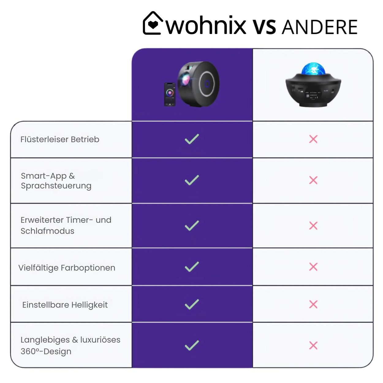 Steuere deinen Projektor mühelos über dein Smartphone oder mit deiner Stimme über Amazon Alexa oder Google Home. Passe Farben, Helligkeit und Rotationsgeschwindigkeit an und speichere deine Lieblings Einstellungen – alles, ohne aufzustehen.