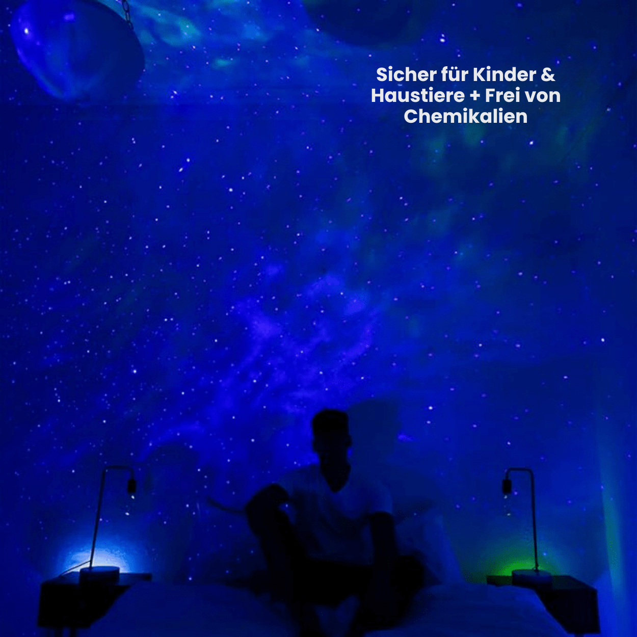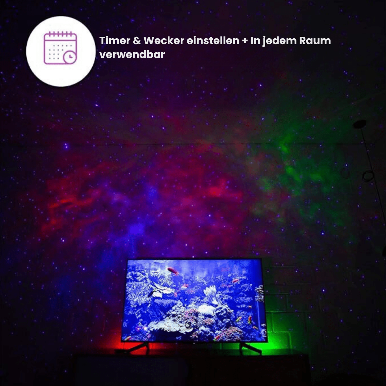 Unser Projektor bietet unbegrenzte Farbkombinationen und anpassbare Helligkeit. Wähle beruhigende Töne oder lebendige Farben, die zu deiner Stimmung und dem Anlass passen.