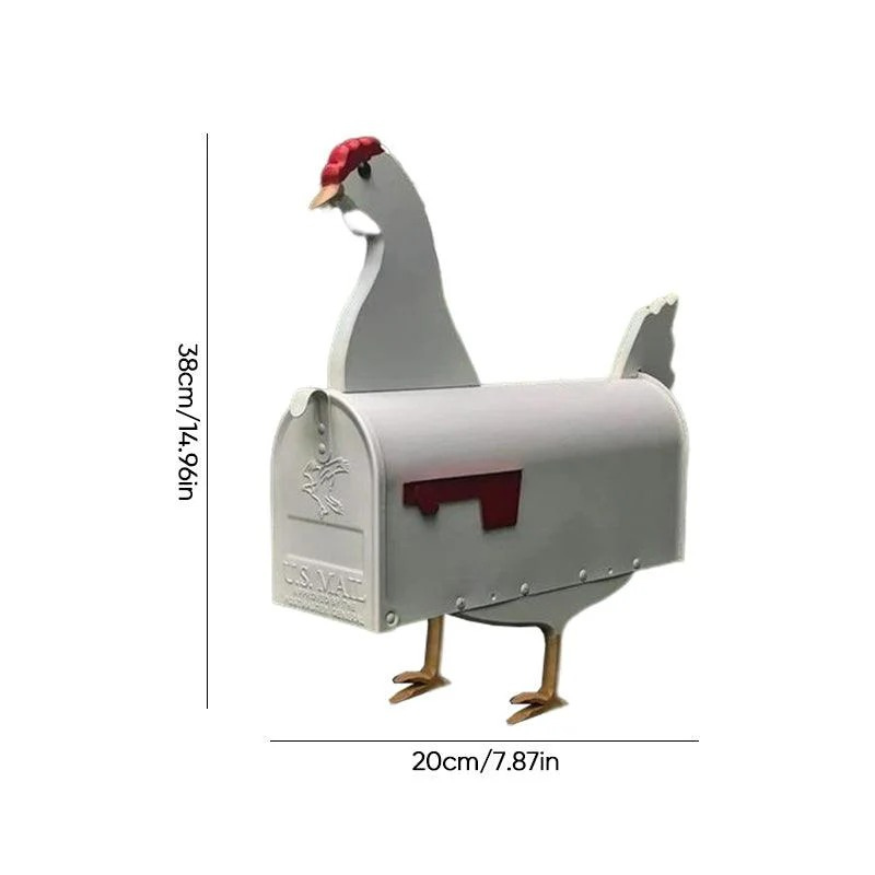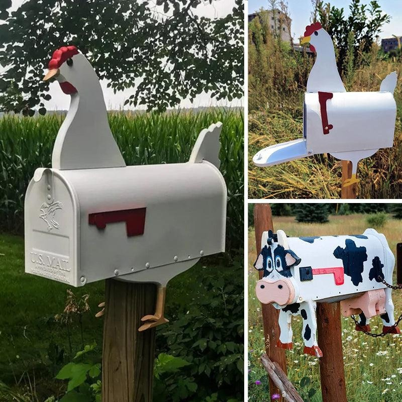 Der **künstlerische Briefkasten** ist in zwei Varianten erhältlich: einer charmanten Hühner- und einer fröhlichen Kuhversion. Perfekt für Garten, Einfahrt, Vorgarten oder Innenhof.