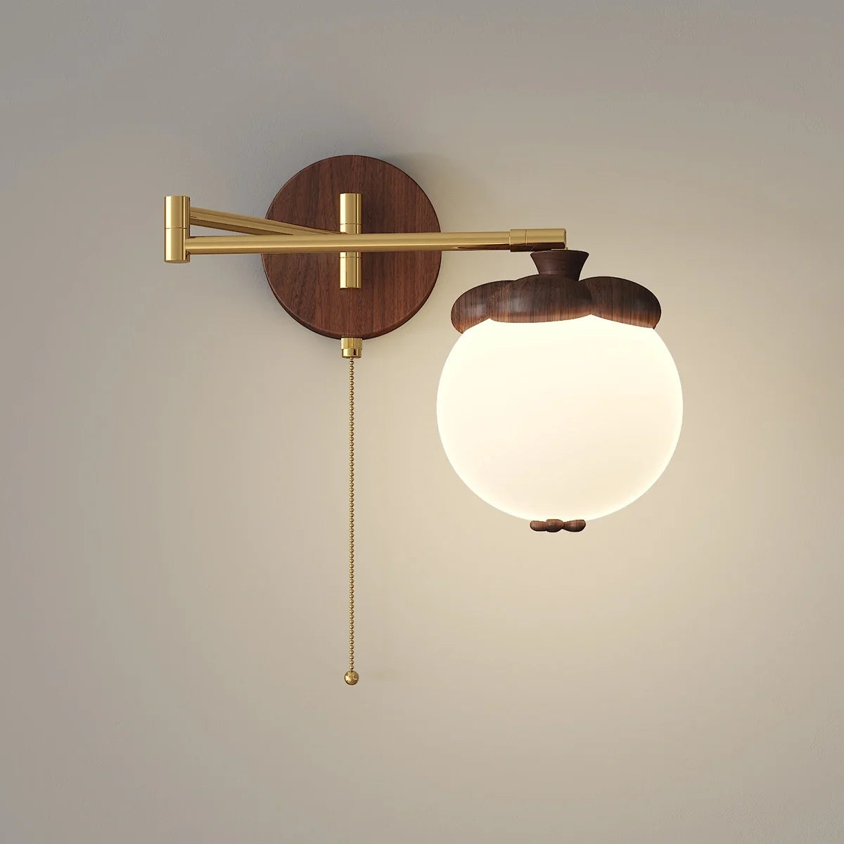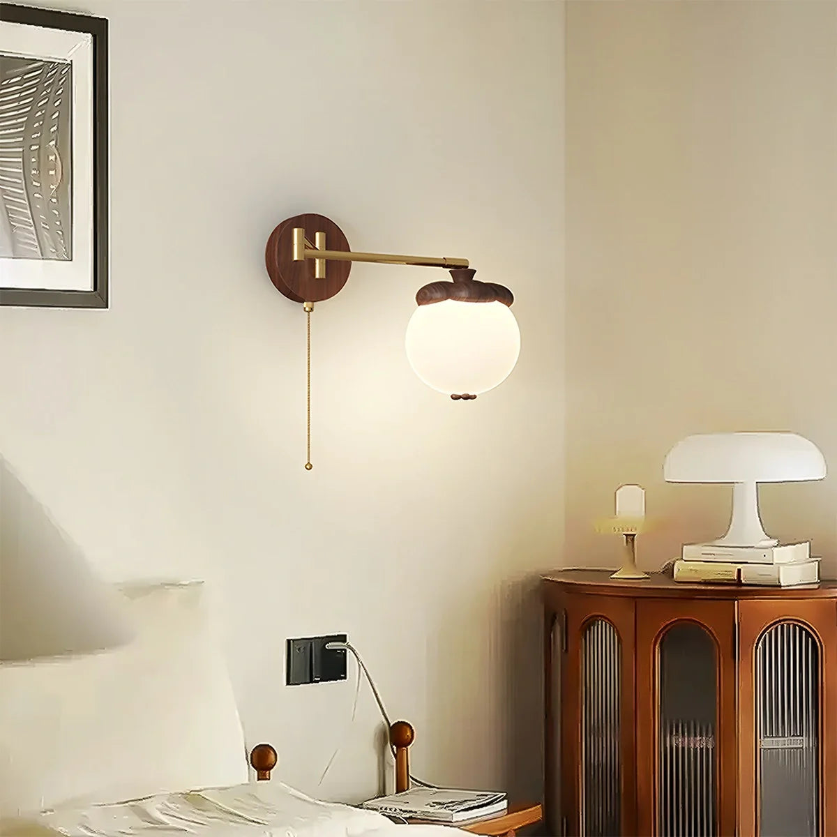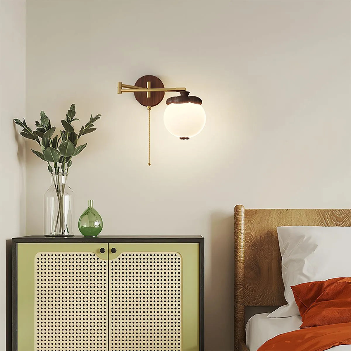 Die **Wandlampe** Lumisa verwandelt Ihre Wände in stilvolle Lichtquellen. Inspiriert von der Form eines Khaki, kombiniert sie eine warme Stoffkappe mit einem verstellbaren Arm, der gezielte Lichtakzente setzt. Ob beim Lesen im Bett oder zur Schaffung einer gemütlichen Atmosphäre im Wohnzimmer – die Lumisa sorgt für Komfort und Bequemlichkeit. Durch die Wandmontage bleibt mehr Platz auf Nachttischen, während das verspielte Design Ihrem Innenraum visuelles Flair verleiht.