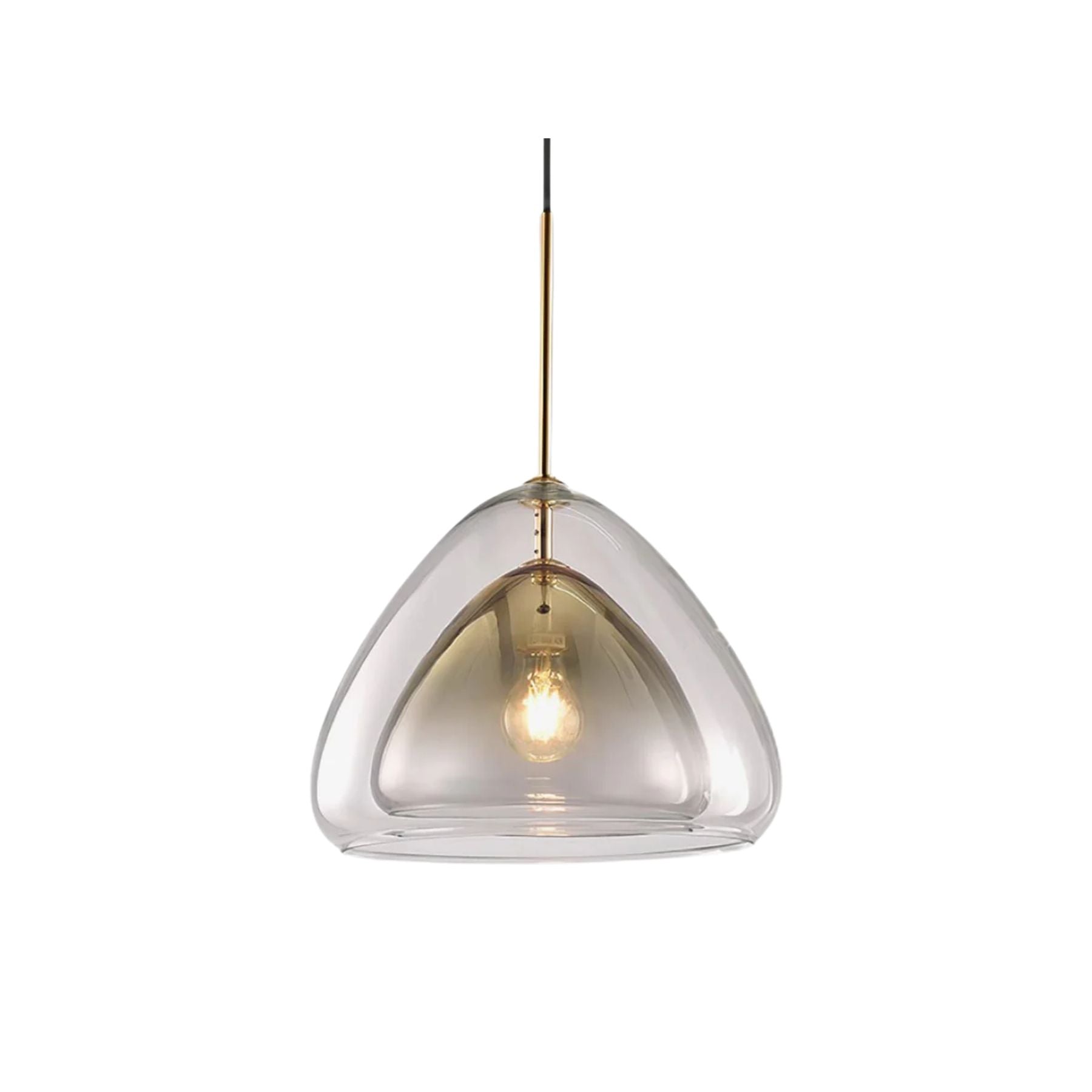 Die **Pendelleuchte** Nolvero verwandelt jeden Raum in eine stilvolle Oase. Mit ihrem transparenten Glasdach und den subtilen goldenen Akzenten strahlt sie eine warme und luxuriöse Atmosphäre aus. Die dreieckige Form, kombiniert mit einem geräucherten Golddreieck, sorgt für einen verspielten Lichteffekt, der jeden Blick auf sich zieht. Ideal über einem Esstisch oder in einem Flur platziert, bietet diese Lampe nicht nur Licht, sondern auch ein elegantes Design, das moderne Wohnräume aufwertet.