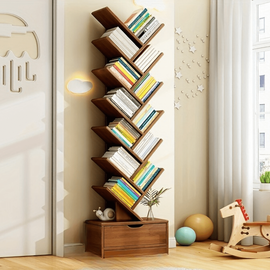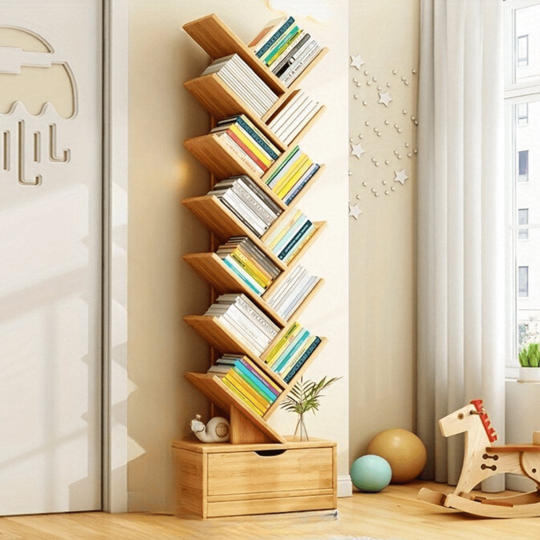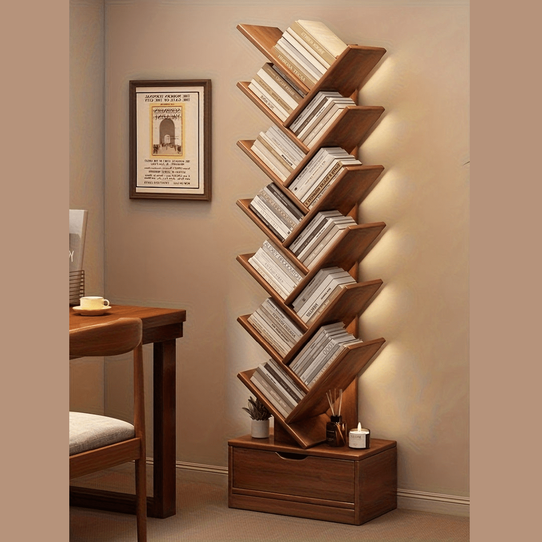 Das **Bücherregal** besticht durch seine moderne Formensprache und die harmonische Farbgebung in Naturholz. Die schrägen Bretter sorgen für eine dynamische Anordnung, die sowohl Ruhe als auch Lebendigkeit in den Raum bringt. Platzieren Sie es neben Ihrem Sofa oder in einer Leseecke, um eine einladende Atmosphäre zu schaffen.