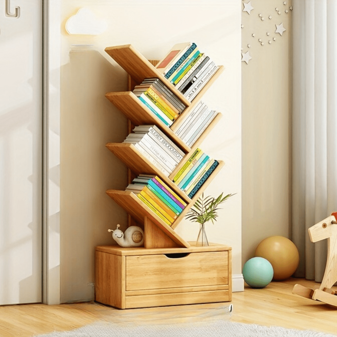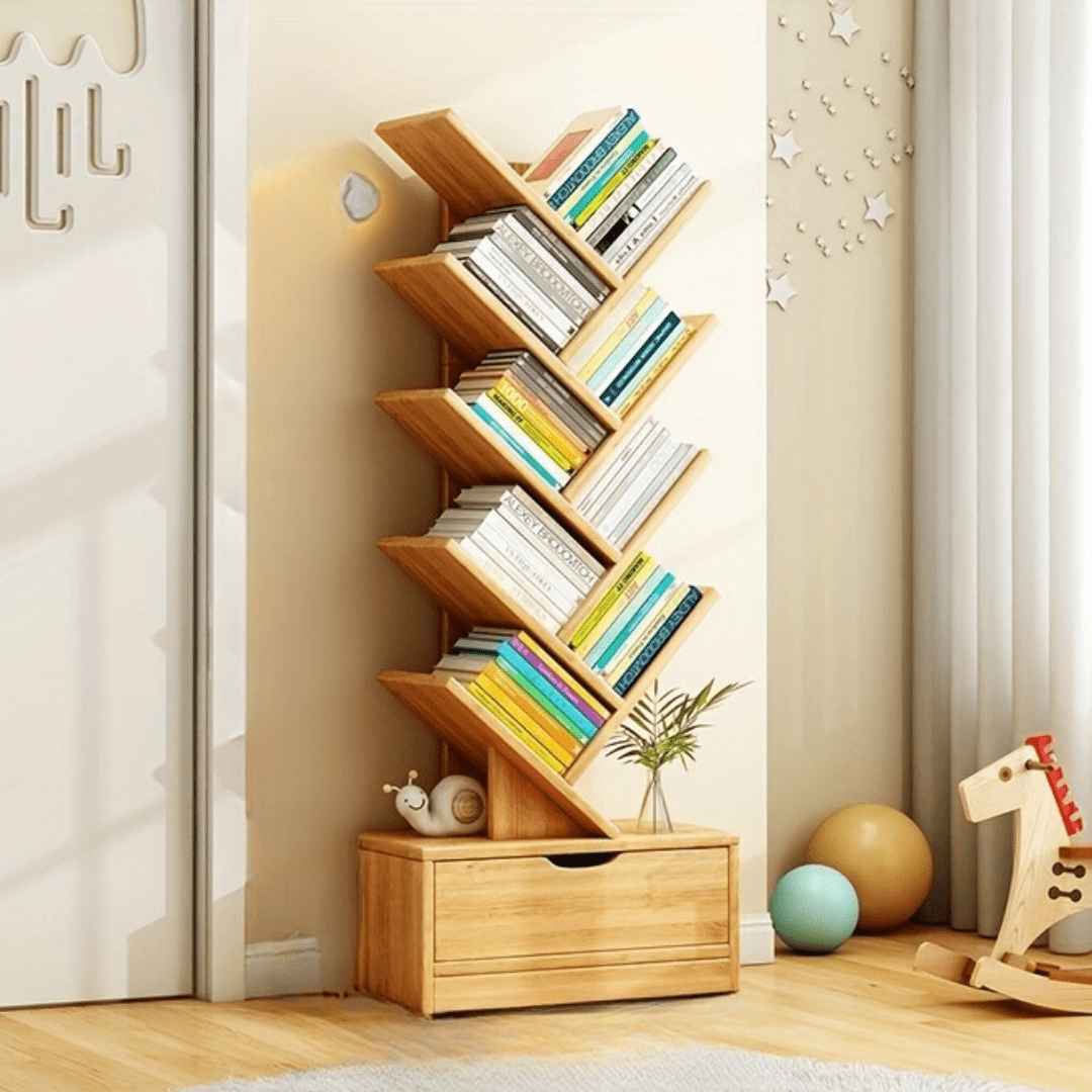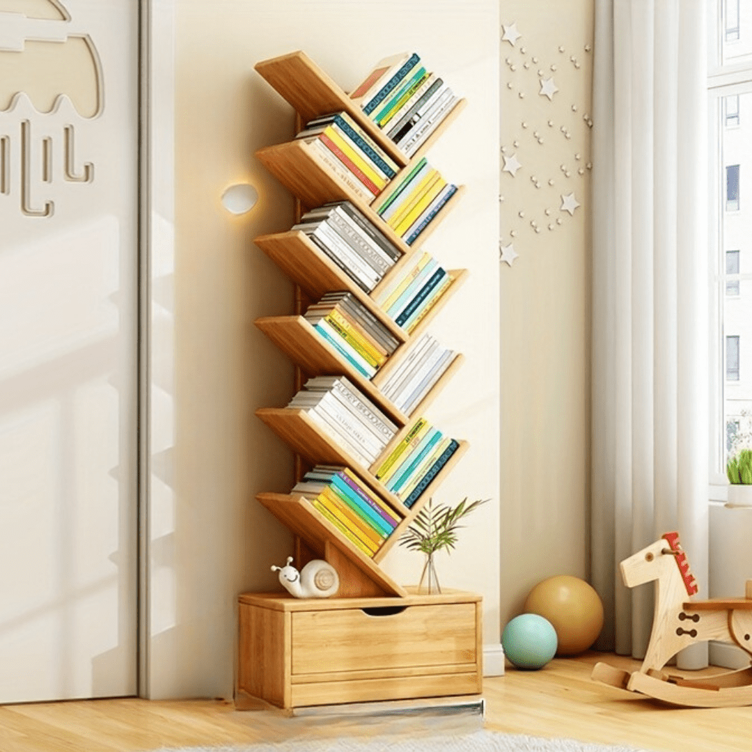 Das **Bücherregal** besticht durch seine moderne Formensprache und die harmonische Farbgebung in Naturholz. Die schrägen Bretter sorgen für eine dynamische Anordnung, die sowohl Ruhe als auch Lebendigkeit in den Raum bringt. Platzieren Sie es neben Ihrem Sofa oder in einer Leseecke, um eine einladende Atmosphäre zu schaffen.