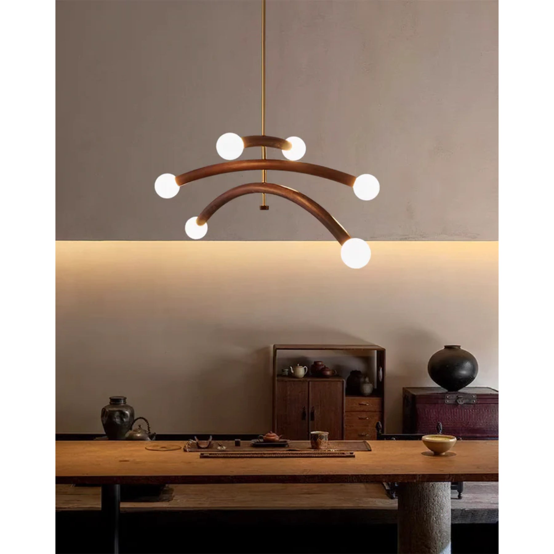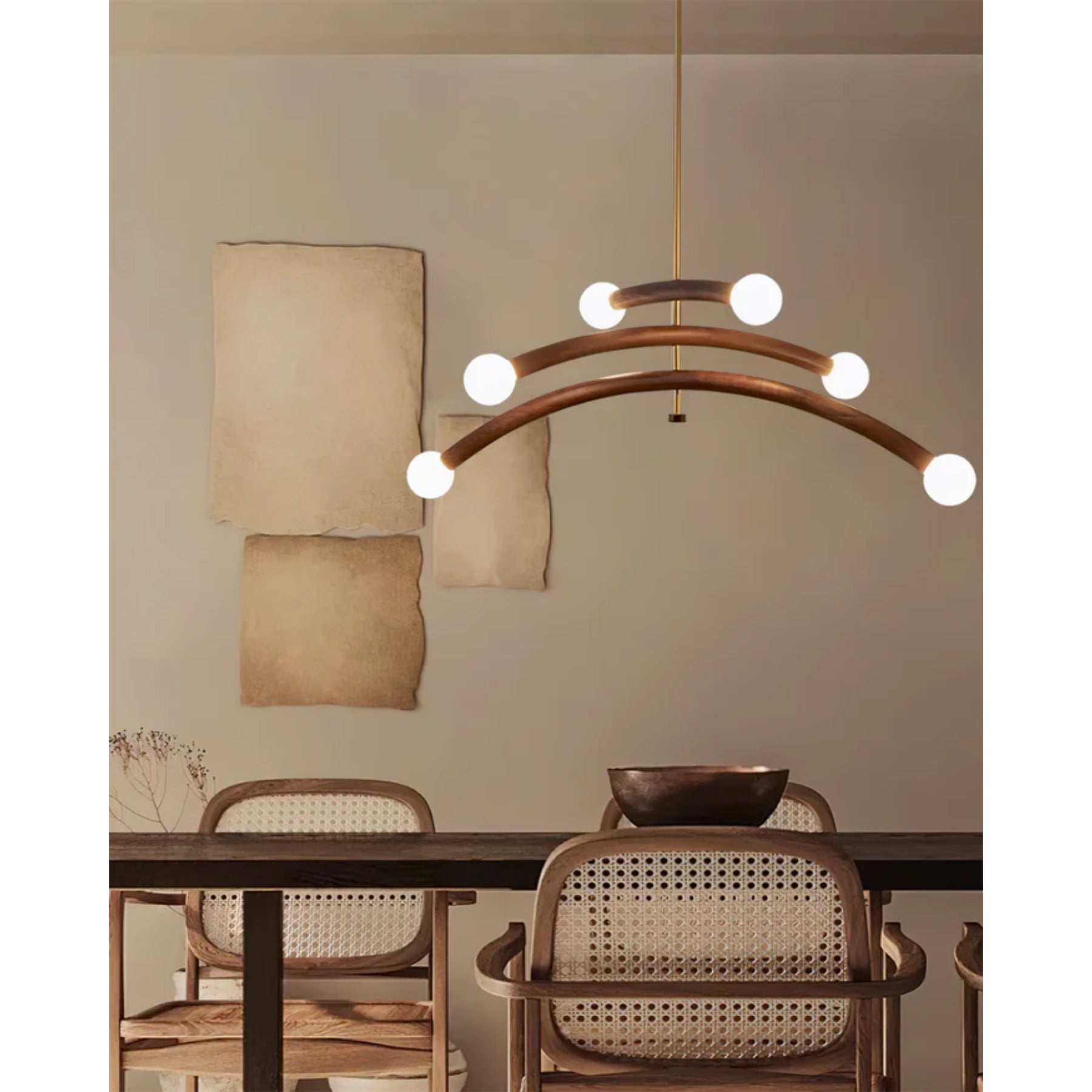 Die **Pendelleuchte** Vetrano verwandelt jeden Raum in eine stilvolle Oase. Mit ihren gebogenen Holzarmen und minimalistischen Milchgläsern strahlt sie ein warmes, einladendes Licht aus. Die kupferhaltigen Akzente unterstreichen den luxuriösen Charakter und machen die Leuchte ideal für den Esstisch oder das Wohnzimmer. Ihr skulpturales Design fügt sich harmonisch in moderne und zeitgenössische Innenräume ein und sorgt für eine beeindruckende Atmosphäre.